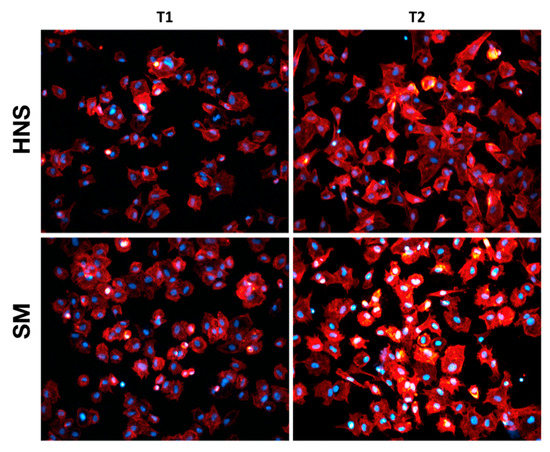 To qualitatively evaluate the early cell morphology, fluorescence microscopy experiments were conducted by marking the cytoskeleton and nuclei. As can be appreciated from Figure 2, no particular alterations or differences in cell morphology are observed between MC3T3s plated on HNS and SM surfaces at T1. On the other hand, a slight difference is observed in the level of spreading, which is greater at T2 than at T1, with cells seeded on HNS surfaces appearing very slightly more elongated and less round than those plated on SM surfaces.
