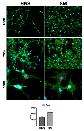 Cell Morphology. MC3T3-E1 seed on HNS and SM sample after 24 h. Staining for Focal Adhesions (Paxillin in red), cytoskeleton (actin, Alexafluor 488-phalloidin in green), neclui (DAPI in blue). Images were acquired at 100, 200, and 600 magnifications. Quantification of cell area performed with ImageJ. Values represent mean ± SEM. The symbol (*) indicates the statistical significance vs. HNS surface, considering a p-value < 0.05.
