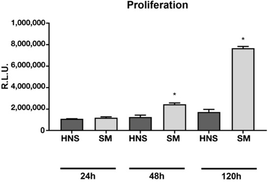 Cell proliferation on HNS and SM surfaces was then evaluated. No significant differences are observed at 24 h, however, starting from 48 h, it is possible to appreciate a significant increase in the proliferation of cells seeded on the SM surfaces compared to those on HNS. This difference is particularly evident considering the data at 120 h (Figure 4).