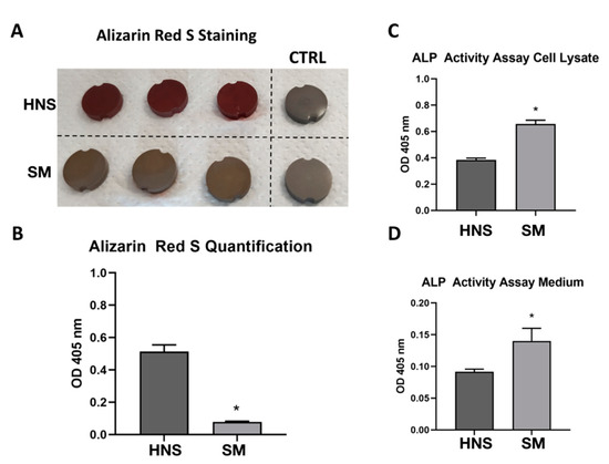 Osteogenic activity of MC3T3-E1 cultured for 21 days in osteogenic medium on HNS or SM surfaces. Representative picture of staining of calcium deposit on titanium samples through Alizarin Red S (A). Quantification of optical density at 405 nm of solubilized Alizarin Red S staining with 10% acetic acid (B). Evaluation of ALP activity on cell lysate (C) and culture medium (D) of MC3T3-E1 by using ALP Activity Assay Kit ab83369 (Abcam). Values represent mean ± SEM. The symbol (*) indicates the statistical significance vs. HNS surface, considering a p-value < 0.05.