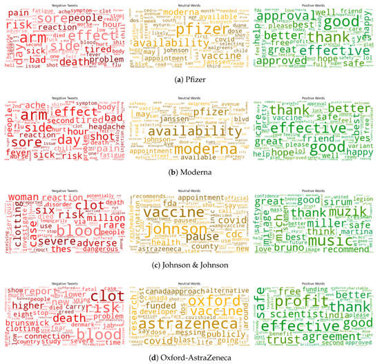 Top frequency word distribution for different vaccines: word cloud generated using word frequencies.