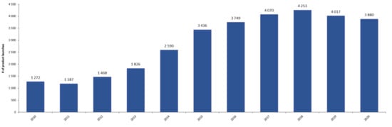 The number of consumers adopting gluten-free diets is increasing constantly. This may be attributed to various reasons, including improved diagnosis of celiac disease, the availability of information about the disease and the belief of some consumers that the gluten-free diet is healthier than a conventional diet. A 2017 survey of USA consumers who eat gluten-free bread found that 31% do so as a lifestyle choice []. As a result of increased demand for gluten-free options, more and more products are appearing on shelves with the Crossed Grain symbol (Figure 1) [], including in the bakery market segment (Figure 2) []. It is noteworthy that the total number of gluten-free products launched in all food categories, including in baked goods, has been growing year on year for the past decade. In 2020, a slight decrease was observed, most likely due to the COVID-19 pandemic.