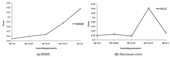 The error analyses were carried out to evaluate the variation of performance according to the variation of learning parameters such as the SSP value, the number of training data, and the number of hidden layers. The SSP values were varied from zero to 0.1 with 0.025 step size, and the accuracy measures such as RMSE and MAX were analyzed. Their results were represented in Table 4 and Figure 13 and Figure 14.