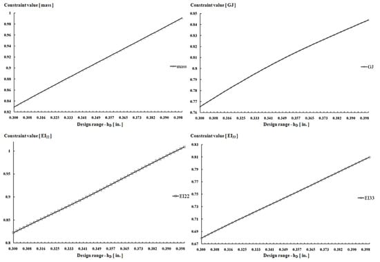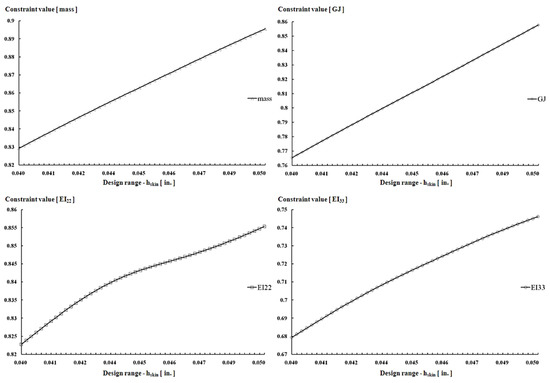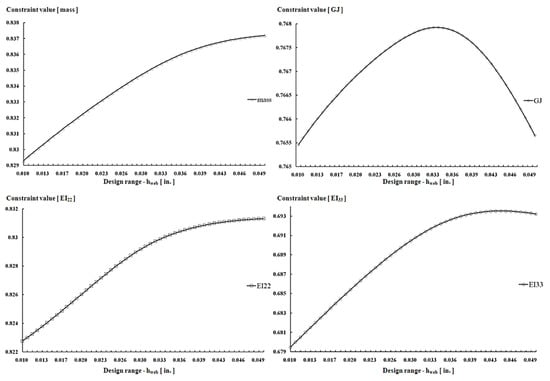 From the meta-modeling results, remarkable multi-modal variations were found in the relations between two design variables (hweb and dang) and the design performance functions. In other design variables such as the thicknesses of D-spar (hD), the skin (hskin) and the web location, their meta-modeling results represented almost linear characteristics. Statistical analyses were also performed to evaluate the main effects of design variables on the responses of design performance functions. The results of statistical analyses were shown in Figure 12.