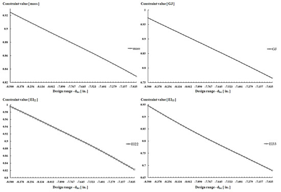In the calculation of design performances, the chord length was considered 20.2 in., and the aerodynamic center was at the quarter chord. In the structure design problem of composite rotor blade, the distance between aerodynamic and shear centers should be minimized to avoid flutter instability of the rotor blade, and to avert the restrictions on the flight envelope. As design performance functions, the structural mass of rotor blade should be minimized while some important internal structural stiffness properties such as torsional (GJ), flap-wise bending (EI22) and chord-wise bending stiffnesses (EI33) were almost maintained at the level of the initial design, i.e., within ±5% variations.