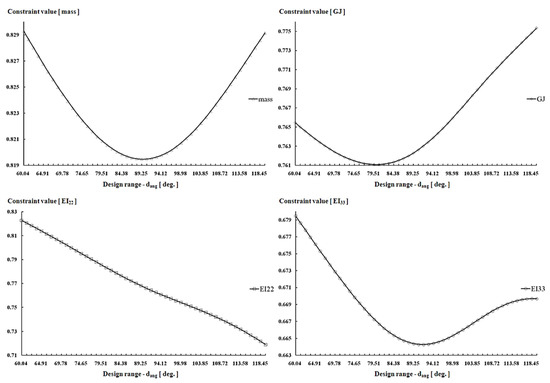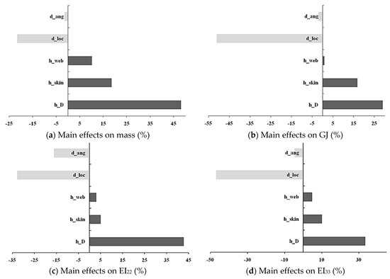 The main effects of hD and dloc among the design performance functions were higher than other design variables. The most sensitive design variable on the mass and the EI22 was the hD, and the main effect values on the mass and the EI22 were 47% and 44%, respectively. The most sensitive design variable on the GJ and the EI33 was the dloc, and the main effect values on the GJ and the EI33 were −52% and −48%, respectively. The statistical results also showed that dloc and dang had negative effects on all the design performance functions while other design variables had positive effects. From the main effect results, it was found that the design performances of rotor blade were increased as the hD value was increased and the dloc value was decreased.