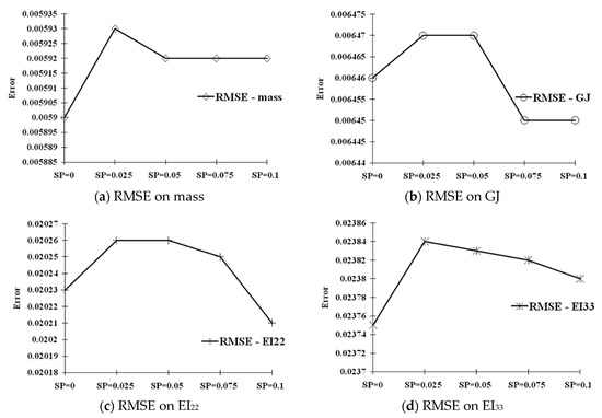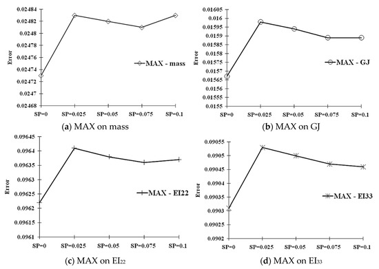 As shown in Table 4 and Figure 13, the RMSEs of Mass, GJ, EI22, and EI33 were distributed in the range of 0.00590 to 0.00593, 0.00645 to 0.00647, 0.02021 to 0.02026, and 0.02375 to 0.02384, respectively, according to the variation of SSP. The MAXs of Mass, GJ, EI22, and EI33 were distributed in the range of 0.02473 to 0.02483, 0.01567 to 0.01589, 0.09622 to 0.09637, and 0.09031 to 0.09046, respectively, as represented in Table 4 and Figure 14. From the results of error analyses, it was clear that the variation of accuracy occurred in the slight magnitude because the rotor blade design problem had relatively a low multi-modal variation as represented in the meta-modeling results and the statistical analysis. Although the influence of SSP was not significant in the RBFNN approximation of the actual rotor blade design problem, it could be seen that the accuracy of the approximation was increased based on RMSE as the SSP was applied in the range of 0.075 to 0.1. The results of error scattering were also evaluated according to the SSP values. The results of error scattering analyses were shown in Figure 15.