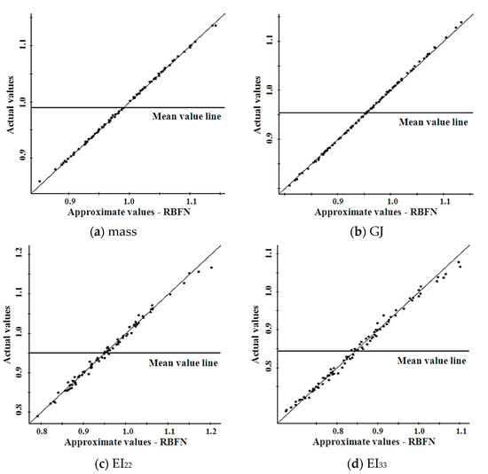 In the present study, the RBFNN-based approximation was carried out for the design performance functions. With 500 training data and 90 testing data, the RBFNN based meta-models were fitted for each design performance function. The fitted RBFNN meta-models of rotor blade design are shown in Figure 7, Figure 8, Figure 9, Figure 10 and Figure 11.