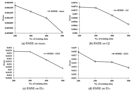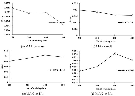 The results of Table 5 and Figure 16 represented that the RMSEs of Mass, GJ, EI22 and EI33 were distributed in the range of 0.00590 to 0.00643, 0.00646 to 0.00737, 0.02023 to 0.02334, and 0.02375 to 0.02787, respectively, according to the variation of training data. It was found that the influence of the number of training data on the accuracy of the meta-model in the rotor blade design was higher than that of the SSP. RMSEs for all the design performance functions were enhanced as the number of training data was increased. The MAXs of Mass, GJ, EI22 and EI33 were distributed in the range of 0.02473 to 0.02509, 0.01567 to 0.01977, 0.08138 to 0.09622, and 0.08316 to 0.09031, respectively, as represented in Table 4. Among the MAX results, however, EI22 and EI33 were deteriorated as the number of training data was increased, as shown in Figure 17. Such result was because some larger deviation data was included in the set of training data.