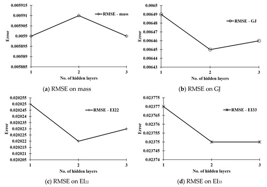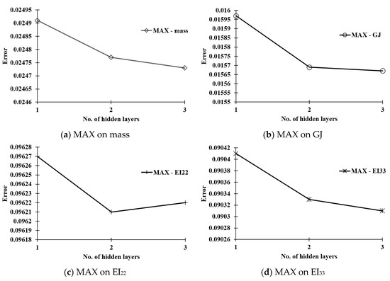 The results of Table 6 and Figure 18 represented that the RMSEs of Mass, GJ, EI22, and EI33 were distributed in the range of 0.00590 to 0.00591, 0.00645 to 0.00649, 0.02023 to 0.02025, and 0.02375 to 0.02377, respectively, according to the variation of hidden layer. The MAXs of Mass, GJ, EI22, and EI33 were distributed in the range of 0.02473 to 0.02491, 0.01567 to 0.01597, 0.09622 to 0.09627, and 0.09031 to 0.09041, respectively, as represented in Table 6 and Figure 19. It was found that the influence of the number of hidden layers on the accuracy of the meta-model in the rotor blade design was scarcely detected comparing with the SSP and the number of training data. Although the effect of the number of hidden layers on the accuracy of the meta-model was insignificant, the RMSEs for all the design performance functions tended to slightly improve as the number of hidden layers was increased. The MAX results were also similar to the RSME results in case of the variation of the number of hidden layers.