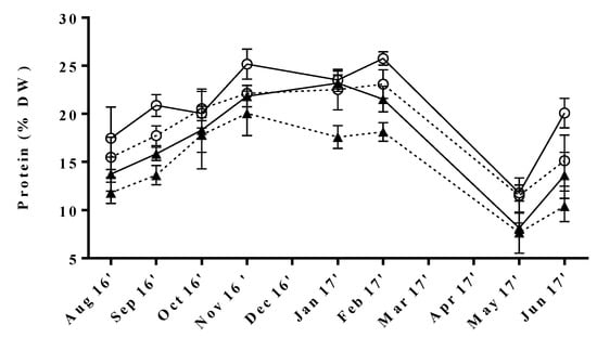 Seasonal variation of protein content in U. rigida produced by IMTA under different conditions of flow rate, high (○) and low (▲); and of stocking density, high (full lines) and low (dotted lines). Standard deviations are represented as bars (n = 3, in triplicate).