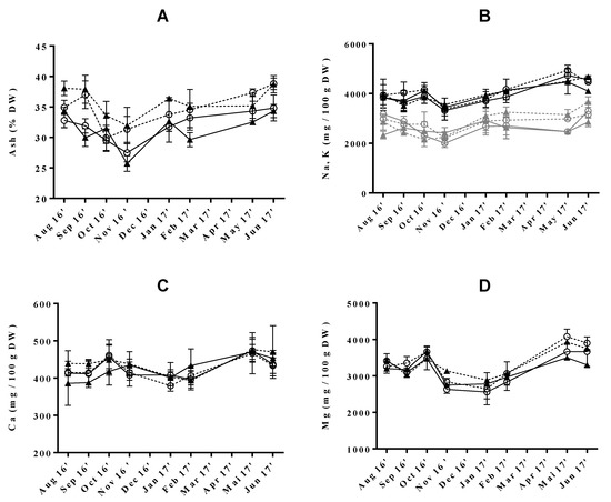 Seasonal variation of (A) ash (% DW), (B) sodium and potassium, (C) calcium and (D) magnesium (mg/100 g DW) in Ulva rigida produced by IMTA under different conditions of flow rate, high (○) and low (▲); and of stocking density, high (full lines) and low (dotted lines). Standard deviations are represented as bars (n = 3, in triplicate).