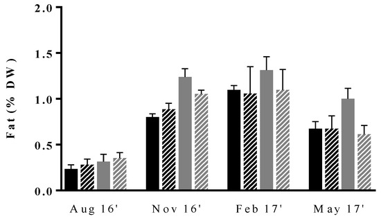 Seasonal variation of fat content (% DW) in Ulva rigida produced by IMTA under different conditions of flow rate, high (dark bars) and low (gray bars); and of stocking density, high (full bars) and low (lined bars). Standard deviations are represented (n = 3, in triplicate).