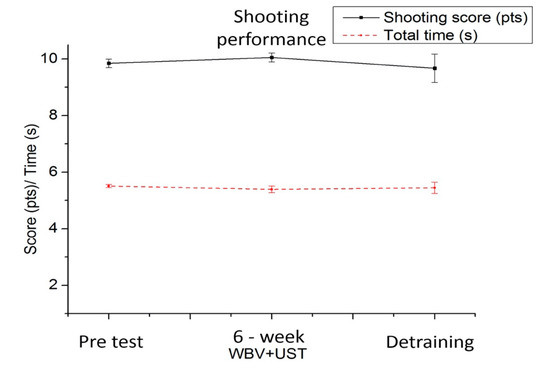 For the shooting score, the one-way RM ANOVA showed a significant difference between testing times (F = 23.730, p < 0.01, power = 0.985). The shooting scores during the 6 week WBV+UST (p < 0.01, 6.25%) greatly improved, relative to those of the pretest. Post hoc testing indicated that the 6 week WBV+UST led to improvements after the pretest performances (Table 3). For the total time, the one-way RM ANOVA showed a significant difference between testing times (F = 5.909, p < 0.05, power = 0.553). The shooting score after the 6 week WBV+UST (2.00%) greatly improved, relative to the pretest performance (Table 3 and Figure 2).