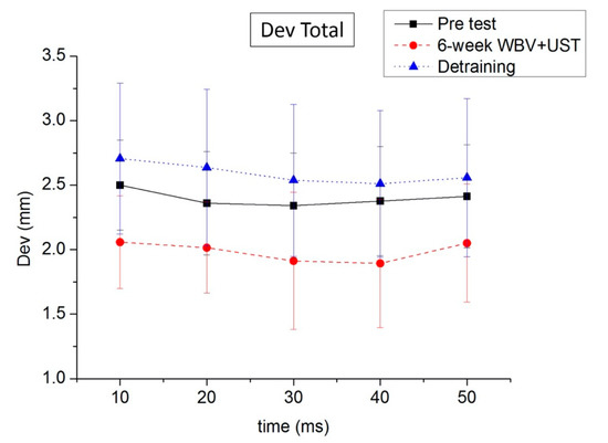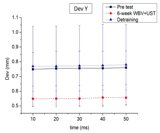 On the shooting performance test, we recorded the trajectory values of the rifle under the 10–50 ms-DevTotal and 10–50 ms-DevY categories. For the 10–50 ms-DevTotal values, the one-way RM ANOVA showed a significant difference between performances at different times: 10 ms (F = 10.610, p = 0.01, power = 0.979), 20 ms (F = 6.292, p = 0.04, power = 0.579), 30 ms (F = 9.811, p = 0.02, power = 0.766), and 40 ms (F = 9.025, p = 0.02, power = 0.732). Furthermore, the 10 ms-DevTotal values after the 6 week WBV+UST (p = 0.04, 17.68%) greatly improved compared with that of the pretest performance. Post hoc testing indicated that the 6 week WBV+UST led to improvements after the pretest performances (Table 3 and Figure 3). For the 10–50 ms-DevY, the one-way RM ANOVA showed a significant difference between performances at different times: 10 ms (F = 29.887, p < 0.01, power = 0.996), 20 ms (F = 31.337, p < 0.01, power = 0.997), 30 ms (F = 30.624, p < 0.01, power = 0.997), 40 ms (F = 31.285, p < 0.01, power = 0.997), and 50 ms (F = 33.699, p < 0.01, power = 0.998). Furthermore, the 10–50 ms-DevY after the 6 week WBV+UST greatly improved, relative to the pretest performance (10 ms (p < 0.01, 26.70%), 20 ms (p < 0.01, 27.10%), 30 ms (p < 0.01, 27.25%), 40 ms (p < 0.01, 26.32%), and 50 ms (p < 0.01, 26.84%)). Post hoc testing indicated that the 6 week WBV+UST led to improvements after the pretest performances (Table 3 and Figure 4).