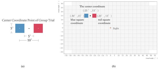 Since the blue target and the red target are both 5° away from the center coordinates of the trial group in the horizontal direction, the center coordinates of the trial group are actually distributed in the range of −50° to 50°. Figure 1b shows the range of an example of the emergence of a trial group. The whole group trial appears at (−25°, 15°), where the coordinates of the blue target are (−30°, 15°), and those of the red target are (−20°, 15°).
