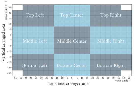 The appearance range of the target takes the visual center as the origin (0°, 0°), distributing at left of the origin from −55° to 0° and at right of the origin from 0° to 55° horizontally, and at above the origin from 0° to 30° and at below the origin from −30° to 0° vertically. The position where the target appears is controlled by the center coordinate of each trial group, and the center coordinate of each trial group appears on the coordinate position, which is multiplied by 5°.