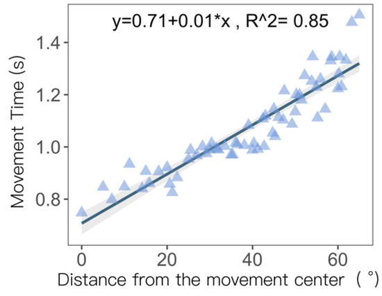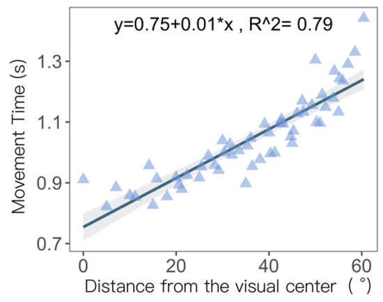0° in the horizontal direction and 0° in the vertical direction was defined as the visual center. Correlation analysis was performed on the movement time and the distance between the target position and the visual center. The result was r = 0.889, p = 0.000, reaching significant relevance at the 0.01 level, seen in Figure 3. There was a significant positive correlation between movement time and the distance between the target and the visual center.