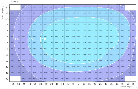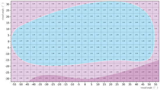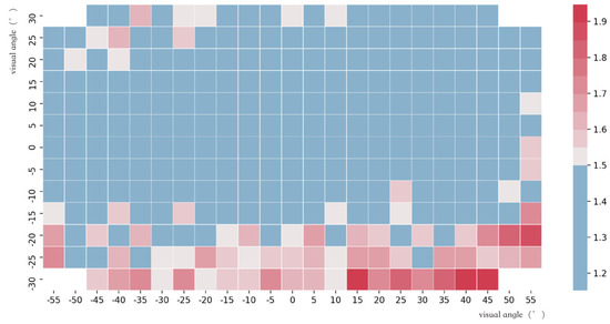 The locations where targets appear are indicated in the grid diagram of the range in 110° × 90°, and each grid represents 5° × 5° space in the FoV. The offset at each location is indicated by color in the corresponding grid, with blue indicating a negative offset and red indicating a positive offset. A heat map was produced (Figure 6) to analyze the click deviation value of the target appearing in different positions. The blue part represents a small click deviation value that is lower than the average value. The red part represents a larger click deviation value that is higher than the average value. The darker the red of the grid, the larger the deviation value at this position. The click deviation value of the target at the bottom position is obviously higher, while the click deviation value in the bottom right corner is obviously higher than that in the lower left corner. The click deviation value of the target at the top position is lower than that at the bottom position, and the click deviation value of the top left corner position is higher.