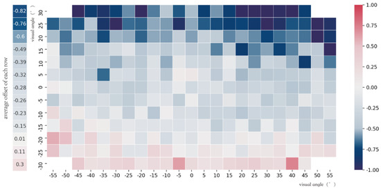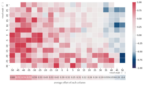 The heat map shows that the offset within the range of −50° to 35° is generally positive, indicating that the click trend was generally rightward. The lowest row of the heat map represents the average offset of each column in the horizontal direction. The smallest average offset in the positive offset area appears in the 15° horizontal arranged area. The range of −50° to −35° shows large rightward deviations (0.68°, 0.72°, 0.74°, 0.71°). However, the range of 40° to 50° produces leftward deviations (−0.059°, −0.28°, −0.4°), which are opposite to the general offset trend.
