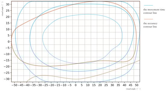 The figure shows that it takes a longer time to click targets when the target appears in the bottom right corner and the top left corner. Movement time includes the duration of visual search and target clicking. All subjects were right-hand dominant, so the targets could be blocked by the right arm to some extent when the target appeared in the bottom right corner. Although the target in the bottom right corner was located in the nearest area to the hand, the occlusion effect of the hand lengthened the visual search time for the targets. The target in the top left corner was located in the farthest area from the starting position of the arm movement, so the clicking time was longer. The overall distribution of the contour lines of movement time tended to be in the right area, indicating that the click time of the right half was shorter than that of the left half, which is related to the starting position of the right hand.