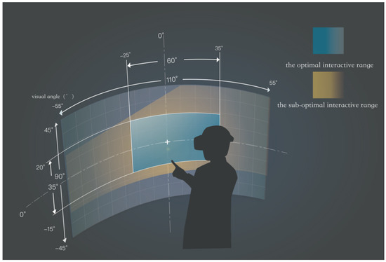 The task performance results delineate different regions of the virtual interface of direct bare-hand click interactions. The optimal interaction area is limited from 25° on the left side to 35° on the right side horizontally and from 20° in the upward view to 15° in the downward view vertically. The experimental results can be used to design interactive interfaces in VEs. We expect that designers will be able to rationalize interaction content based on human attention bias and the dominant areas of hand–eye coordination, to derive dominant control areas for a proper placement of controls, functions, and menus. The results of this study represent an extension of existing research and provide practical guidelines for the design of interactions in VEs. While the study was conducted under VR conditions, the findings can also be applied to AR (Augmented Reality) or MR (Mixed Reality).