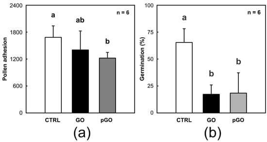 Pollen adhesion (a) and pollen germination (b) observed on Cucurbita pepo L. stigmas coated with 0 (CTRL) or 1 mg of graphene oxide (GO) and purified GO (PGO), and pollinated after three hours (for more details, see Section 2.2 and Section 2.4). Values are means ± s.d. (n = 6 stigmas). Statistically different groups are marked with different letters (GLM analysis, followed by Bonferroni t-test for more details, see Table S1).