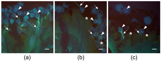 Fluorescence micrographs of stigmas of Cucurbita pepo L. coated with 0 (CTRL) (a) or 1 mg of graphene oxide (GO) (b) and purified GO (PGO) (c), and pollinated after three hours (for more details, see Section 2.2 and Section 2.4). Pollen tubes, pollen grains and GO flakes/nanoparticles are indicated with arrows, arrowheads, and asterisks, respectively. Bars = 100 µm.