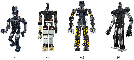 THORMANG platform at DRC Finals in 2015: (a) THORMANG, TEAM SNU (1.47 m, 60 kg), (b) THOR-RD, TEAM THOR (1.50 m, 54 kg), (c) Johnny05, TEAM Hector (1.47 m, 55 kg), (d) THORMANG2, TEAM ROBOTIS (1.60 m, 60 kg).