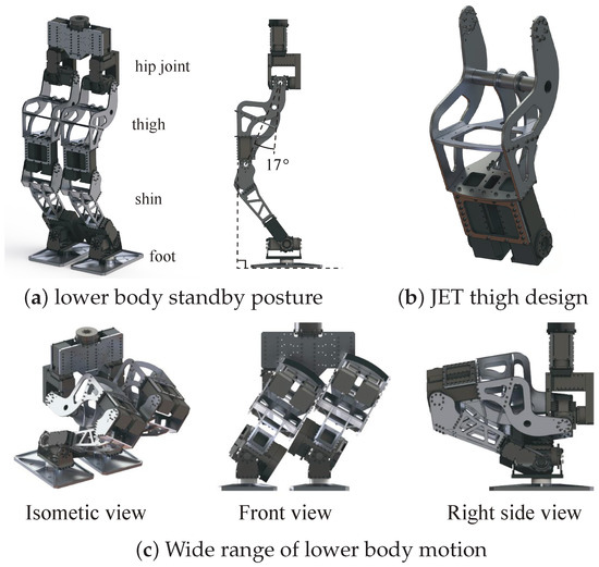 In addition to overcoming the above THORMANG limitations, to achieve compliance, whole-body motion capability, and easy maintenance, as mentioned in Section 1, the following three philosophies were adopted as the JET design goals.