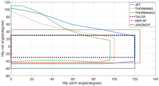 JET has the same hip joint structure as THORMANG. The hip joint consists of two actuators in roll-pitch order, as shown in Figure 5a, and each axis of rotation is orthogonal at the initial position. To increase the ROM, an S-shape thigh frame was devised, as shown in Figure 5b. This thigh frame reduces interference between the motor and thigh frames, thereby increasing the hip joint ROM, as shown in Figure 5c. Figure 6 compares the JET, THORMANG, THORMANG3, and TALOS ROMs. Because of self-collision, the ROM of one joint is not independent of another joint position. Thus, thigh frame was designed for ROM expansion when both hip joints bend. Hence, the ROM of the two hip joints was expanded by 39.3% and 36.7%, respectively, compared to THORMANG and THORMANG3. The hip joint ROM of TALOS, which is introduced in [18], is also smaller than the ROM of JET. The authors of [21] developed HRP-5P, which has larger hip roll ROM than that of JET when the pitch angle is 110°. JAXON3-P, which has a 1.7 m height and 70 kg weight, also has larger hip roll ROM than that of JET when the hip pitch is 110° [24]. To increase the knee ROM, the curves of the back of the thigh and shin frame were designed similarly, and the knee actuator was relocated from the shin to the thigh. These changes allow JET to perform more varied postures than THORMANG.