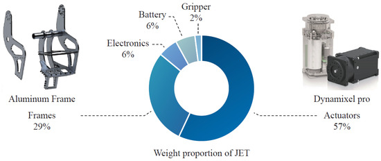 Figure 8 shows the overall weight proportions of each JET component. The actuators occupy more than 50% of the total robot weight. As the ratio of the actuators to the total weight is significant, the actuator arrangement played an important role in load reduction. In various studies, four bar linkages or ball screws have been used to position the actuators close to the first limb joint [27,28]. Although transmission helps reduce inertia, these approaches increase the overall weight and mechanical element number. Such changes would complicate achievement of the design goals in this case.