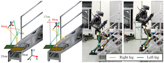 Whole-body motion capability was verified through the following experiments. Stair climbing and egress experiments were chosen among the DRC Finals missions. Both tasks were the hardest tasks in the DRC Finals because THORMANG has short legs for these missions. First, the lower body workspaces were validated through stair climbing experiments on 23 cm high stairs, which were the same height as the stairs used in the DRC Finals. As shown in Figure 10, JET walked up the stairs without any of the THORMANG strategies applied at the DRC. That is, THORMANG climbed the stairs without bumping into the stairs themselves by grabbing the rails and walking backwards [11]. The required foot workspaces of the JET for climbing stairs are cm for x-axis, cm for y-axis, and 23 cm for z-axis as shown in Figure 10. The x and z axis workspaces are determined by the dimensions of the stairs. Figure 11 shows the total foot workspace of JET, THORMANG, and HRP-5P and the required workspaces of the robots. In Figure 11d, JET has a 32 cm z-axis workspace from −75 cm to −43 cm. In the same way, HRP-5P has a 34 cm z-direction workspace from −77 cm to −43 cm, but THORMANG has only a 17 cm z-direction workspace from −59 cm to −42 cm. In this experiment, JET used the same walking pattern generation algorithm which was used at the DRC Finals [11].