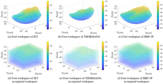 Comparison of foot workspace among JET, THORMANG, and HRP-5P. (a–c) are the total foot workspaces of JET, THORMANG, and HRP-5P. (d–f) are the required workspaces with 60 cm × 34 cm on x- and y-axis.