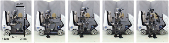 Next, we confirmed the robot could rise from a 64 cm high vehicle seat using whole-body motion with multiple contacts. Figure 12 shows snapshots of the robot egress from the vehicle. In this experiment, the robot performed whole-body motion with contacts at the gripper, pelvis, and two feet. The gripper holds the hand rail to stabilize the body during the JET stand-up. This demonstrated not only the improved robot workspaces, but also the robot’s capability to execute compliant motion in multiple-contact situations. In this experiment, the personal mobility vehicle which was designed for adults is used. The height of the vehicle seat is 56 mm, which is shorter than the fully stretched leg length of THORMANG.