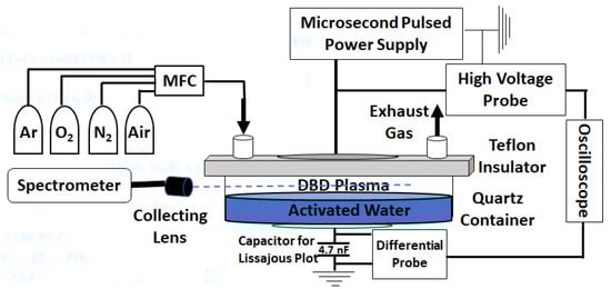 Figure 1 shows a schematic diagram of the experimental setup for a plasma-water system. A quartz container with an internal diameter of 139 mm and a height of 12 mm, including the distilled water with two parallel stainless electrodes (diameter of 90 mm) and a quartz plate (thickness of 1 mm) as a dielectric layer sustains a DBD over the water surface. A pulse DC power controller (SPIK 2000 A, Shenchang Electric Co. Ltd., Taipei, Taiwan) drives a bipolar waveform with a frequency of 20 kHz. Then the generated waveform goes up to the value of 12 kV using a high-voltage step-up transformer to produce DBDs over the water surface. By adjusting on-time and off-time, which were selected to be 5 µs and 20 µs, the duty cycle was 0.2. The container was filled with 80 mL of distilled water so that the gap distance between the water interface and the quartz plate was 2 mm. The Teflon insulator covered the upper electrode where two ports exist for the gas inlet and outlet. Air, nitrogen, oxygen, and argon as gas feedings were selected to be injected individually. The flow rate during the experiment was fixed to be 2 slm (standard liters per minute) using mass flow controller (MFC). The plasma treatment time was selected to be 2, 4, 6, 8, 10, and 12 min.