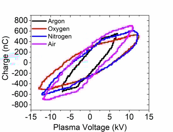 The Lissajous curve deviates (or rotates) a little bit with different gas feedings. This deviation indicates that using different gas feedings changes plasma conditions and thus affects the Lissajous curve. A similar deviation was observed in a DBD reactor with nitrogen and a mixture of nitrogen and oxygen species [20].