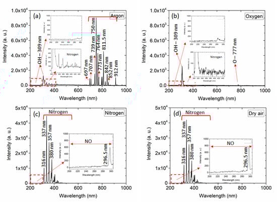 Optical emission spectroscopy for (a) argon, (b) oxygen, (c) nitrogen, and (d) dry air DBD plasmas in the gas phase.