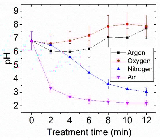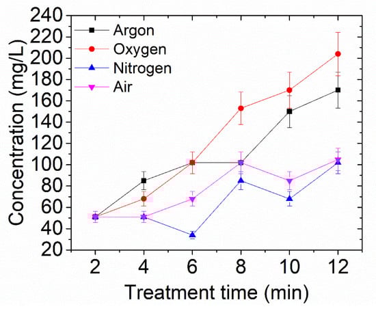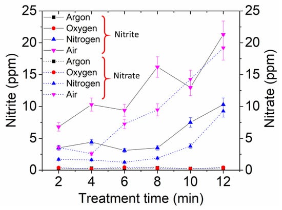 Figure 6 shows the nitrite and nitrate concentrations as a function of treatment time. In the case of oxygen and argon plasmas, nitrite was not detected, and nitrate concentration was extremely low. Since both nitrogen and oxygen species are present in the air during the plasma process, nitrite and nitrate concentrations in the air plasma are higher than nitrogen plasmas, as shown in Figure 6. Similar results associated with the produced nitrite and nitrate were reported using a needle electrode with the mixture of nitrogen and oxygen [18]. Spark and glow discharges using a needle electrode are able to generate PAW with a high acidity level (low pH level) [39]. Nitrite and nitrate concentrations rise by increasing treatment time. As mentioned before, the presence of nitrite and nitrate as oxidizing agents results in reducing the pH value of PAW [30,40].