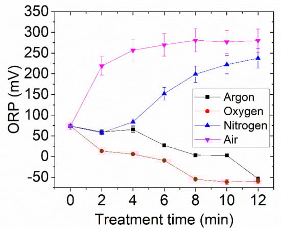 Figure 5 shows the ORP values, which reflect electron transfer ability through chemical reaction strength in the PAW versus treatment time with different feeding gases. The figure depicts two main trends: the first corresponds to the argon and oxygen plasmas treatment, which tend to decline. The other corresponds to the nitrogen and air plasma treatment which has a rising trend. It means that nitrogen and air plasma oxidizing species generated inside the PAW are stronger than argon and oxygen plasmas, probably due to nitrous and proxy-nitrous acid in nitrogen and air DBD plasmas (Reactions 28, 30, 32, and 33). As a comparison of trends in pH (Figure 4) and ORP (Figure 5), high ORP and low pH values appeared with increasing treatment time in the cases of air and nitrogen DBD systems. A similar result was reported by C.Y. Hou et al. [35] and C.M. Lin et al. [36] in a PAW generated by an air plasma jet. Abuzairi et al. [37] presented a PAW using an air surface discharge. ORP and pH trends are the same as our air and nitrogen DBD systems, although they measured three timepoints merely. In addition, Hoeben et al. [38] measured ORP and pH values of a PAW in an arc discharge. ORP versus pH values have the same trend compared to our system, although the discharge regime is different from our air and nitrogen DBD systems. In contrast, the pH value of PAW generated by cold argon/oxygen plasma microjet reported by Tian et al. [20] does not change significantly, although the ORP level increases slightly.