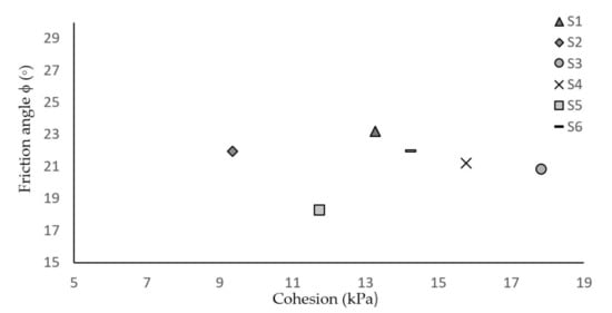 | Test | Cohesion (kPa) | Friction Angle ϕ (°) | Cohesion (kPa) | Friction Angle ϕ (°) | Cohesion (kPa) | Friction Angle ϕ (°) | Cohesion (kPa) | Friction Angle ϕ (°) | Cohesion (kPa) | Friction Angle ϕ (°) | Cohesion (kPa) | Friction Angle ϕ (°) |