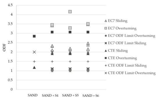 - The walls of lower height show a greater increase in partial safety coefficients regarding the limit values in accordance with EC7-Part 1, mainly due to the decrease in lateral earth pressure at the back, as a result of the low unit weight and lack of cohesion of the tyre granulates.