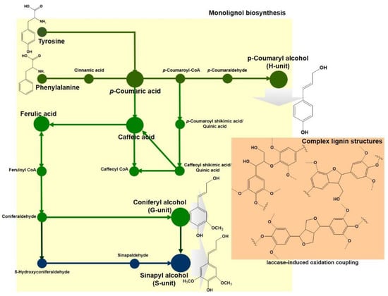 Lignin is one of the main components consisting of a plant biomass. Lignin has a unique structure of closely associated cellulose and hemicellulose, which resists the bio-degradation of plant cell walls to protect plants against environmental stress [,,,]. Lignin is a heterogeneous polymer containing various aromatic structures consisting of phenylpropane subunits, linked with carbon–carbon (C–C) or ether (C–O–C) into a complex three-dimensional structure [,,]. The complex structure of lignin is initially biosynthesized from an aromatic amino acid phenylalanine or tyrosine. Then, the aromatic amino acid is converted into p-coumaryl alcohol via the phenylpropanoid pathway following deamination, ring hydroxylation, methylation, and carboxyl reduction. Following that, p-coumaryl alcohol (H-unit) is elaborated to coniferyl and sinapyl alcohols (G- and S-units). These phytochemical substances of the three alcohol types are called monolignols or lignols, which are the main building blocks of lignin structures [,,] (Figure 1).
