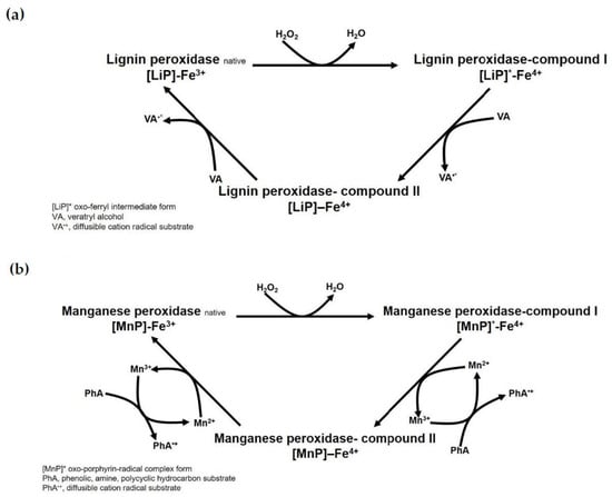 Lignin peroxidase (LiP: EC 1.11.1.14) was the first reported lignin-degrading oxidase. This oxidase is an extracellular heme glycoprotein with approximately 35–50 kDa and pI of 3.0–4.0 belonging to the heme oxidase II family [,]. Since LiP activity was identified in a white-rot fungus P. chrysosporium, most laccase-produced mushroom species, including C. cinereus, L. edodes, P. eryngii, P. ostreatus, P. sajor-caju, and T. versicolor, can produce LiP and/or other oxidase enzymes together [,]. The number of LiP coding genes for isoenzymes, their expression level, and their productivity depend on the fungal growth condition, inducers, growth stage, medium composition, etc. These LiPs play an active role in lignin depolymerization, similar to other extracellular oxidases including laccase, manganese peroxidases (MnP), and versatile peroxidases (VPs) [,,,,]. In lignin depolymerization, LiPs attack Cα–Cβ linkages in phenylpropanoid units and β–O–4 ether linkages between the side chain and the next subunit to open aromatic rings []. Since the mechanism of lignin degradation by these extracellular class II peroxidase has been determined by using protein structure models with biochemical characterizations [,], the basic reaction is identified as a heme oxidase involving H2O2. In the depolymerization of lignin, this oxido-reduction reaction is initiated when H2O2 accesses the heme prosthetic group via the heme channel, acts as an electron acceptor, and then reduces to water (Figure 2a). Interestingly, LiP has a higher redox potential (E0′ ≈ 1.2 V versus Standard hydrogen electrode, SHE) than other oxidases and therefore can oxidize both phenolic and non-phenolic compounds in the absence of mediators [,]. This advantage of LiPs displayed the broad substrate specificities for a variety of applications to degrade recalcitrant petroleum-based chemicals [,,].