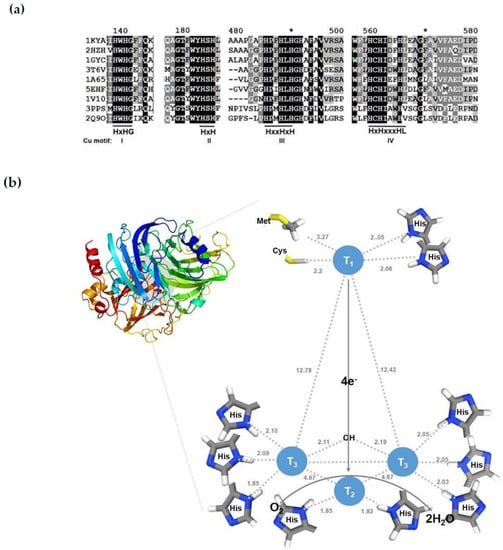 The overall sequence homologies of fungi laccase proteins are less than 30%. Nevertheless, the copper-binding motifs and the overall structures are well-conserved and share several residues close to the metal-binding site (Figure 3a). Laccases have four copper-binding motifs conserved: NH2-His-x-His-Gly-CO3- for Cu motif I, NH2-His-x-His-CO3− for Cu motif II, NH2-His-x-x-His-x-His-CO3− for Cu motif III, and NH2-His-Cys-His-x-x-x-His-x-x-x-x-Met/Leu/Phe-CO3- for Cu motif IV (where x represents any amino acid). A protein structural analysis of mushroom laccase revealed that the active sites consist of four copper centers with four different catalytic forms (T1, T2, T3, and T2/T3), which are arranged with the identified residues of the motifs for the interaction of copper atoms [,] (Figure 3b). The T1 copper atom is bound by Cys, Met, and His residues in the motif IV and another His residue in motif III, with a distance of 2.05–3.27 Å. This T1 copper-binding protein or domain is called cupredoxin. The T2 copper atom of the trinuclear center is coordinated by two His-residues in motifs I and III, with a distance of less than 2.0 Å. The other two T3 copper atoms have interactions with three His-residues in motifs I―IV, with a distance of about 2.0 Å. In addition, the three T2/T3 copper atoms are arranged in a triangular fashion. Six His-residues in the copper-binding motifs coordinate the T3 copper pair, while T2 is coordinated by the other two His residues in the motifs. The four residue-bound T1 copper atoms are distant from the T3 copper atom consisting of the trinuclear center with a distance of around 13 Å. These copper ions binding in the active sites are classified as T1, T2, and T3 according to their different spectroscopic characteristics with the signals of electronic paramagnetic resonance (EPR) [].