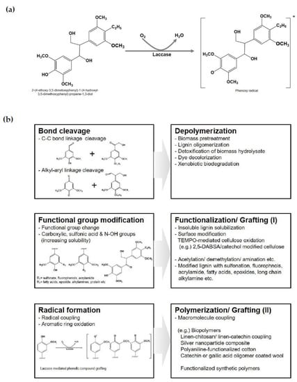 Summary of the potential applications of various lignin derivatives and other biomolecules by laccase catalytic activity for lignin valorization. (a) Schematic representation of the laccase catalytic mechanism (b) Biotechnological applications for depolymerization, grafting, and polymerization based on laccase catalytic activities.