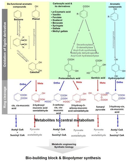 Only two monomers among the 37 putative chemicals derived from lignin are biologically producible in temperature below 50 °C and under mild reaction conditions: hexa-2,4-dieneioic acid (muconic acid) and medium-chain-length polyhydroxyalkanoate. These two chemicals were biosynthesized by a wild type or engineered Pseudomonas strain, which is the most dominant soil bacteria capable of mineralizing a broad range of recalcitrant xenobiotics [,]. Various Pseudomonas strains and other bacteria can degrade aromatic compounds to either catechol or protocatechuic acid [,]. Through subsequent oxidative reactions, these compounds are converted to acetyl-CoA and succinate or pyruvate and acetaldehyde, which are common metabolites in the main metabolisms of most organisms (Figure 5) Depolymerized heterogeneous monomers from lignin consisting of syringyl-, gualacyl-, and hydroxyphenyl-aromatic polymers can also be metabolized to reconstruct various bio-building blocks by microorganisms engineered through metabolic engineering or synthetic biology technology [,,,]. Since the reconstruction of a bio-building block through bacterial metabolisms of lignin monomers has been proposed, various microorganisms have been engineered to convert lignin and lignin-derived aromatics into a variety of value-added compounds: cis,cis-muconic acid, catechol, protocatechuate, benzoate diol, p-hyroxybenzoate, guaiacol, pyrogallol, syringate vaillin, vanillate, vanillyl alcohol, coniferyl aldehyde, pyruvate, lactate, succinate, pyridine-related organic acids, polyhydroxyalkanoates (PHAs), and lipids [,,,,]. Recently, itaconic acid, a chemical building block listed among the top 12 value-added chemicals, was also produced from p-coumaric acid by the engineered Pseudomonas strain [,]. In addition, the engineered Pseudomonas strain accumulated and converted p-coumaric/ ferulic acid into 4-vinylphenol/4-vinylguaiacol, which were further applied to polymerize 4-vinylguaiacol and 4-vinylcatechol styrene by the enzymatic reaction of T. versicolor laccase [].