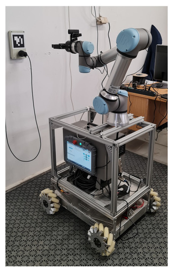 A home-made frame was built in order to host the collaborative robotic arm. The frame is based on a Bosch Rexroth aluminum alloy strut, with a 30 × 30 mm profile. The different profiles of the frame have been connected using angle brackets, and fixing on the whole frame on the mobile platform was performed using a combination of T-slot nuts and profile screw connectors.