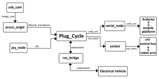 serial_node: From the rosserial_python ROS package [25]. The node ensures communication between the HLC and the mobile platform. The latter is controlled by an Arduino Mega board, which runs a node that subscribes to the velocity commands published by the plug_cycle node to control the transnational and rotational movements of the mobile platform.