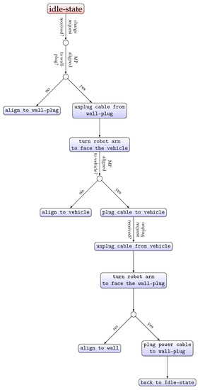 The software architecture is based on a decision-tree algorithm [32]. Each sequence is a set of conditions that need to be successfully fulfilled in order to move to the following sequence. The intuitive sequence of the commands that the ACS performs follows what a human would perform when performing the same task: going to where the charging cable sits, grab the cable, move towards the vehicle, and then plug the cable in. When the vehicle is finished charging, he/she would then unplug the cable, and sit it back in its original place for later use.